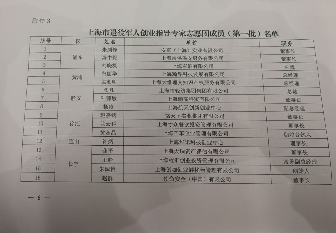 會(huì)上,市人力資源和社會(huì)保障局就業(yè)處副處長黃河宣讀了《關(guān)于認(rèn)定上海市退役軍人職業(yè)技能承訓(xùn)機(jī)構(gòu)(第一批)、退役軍人創(chuàng)業(yè)孵化示范基地(第一批)和退役軍人創(chuàng)業(yè)指導(dǎo)專家志愿團(tuán)成員(第一批)的通知》。宗保公司董事長馮中保被認(rèn)定為上海市退役軍人創(chuàng)業(yè)指導(dǎo)專家志愿團(tuán)成員。