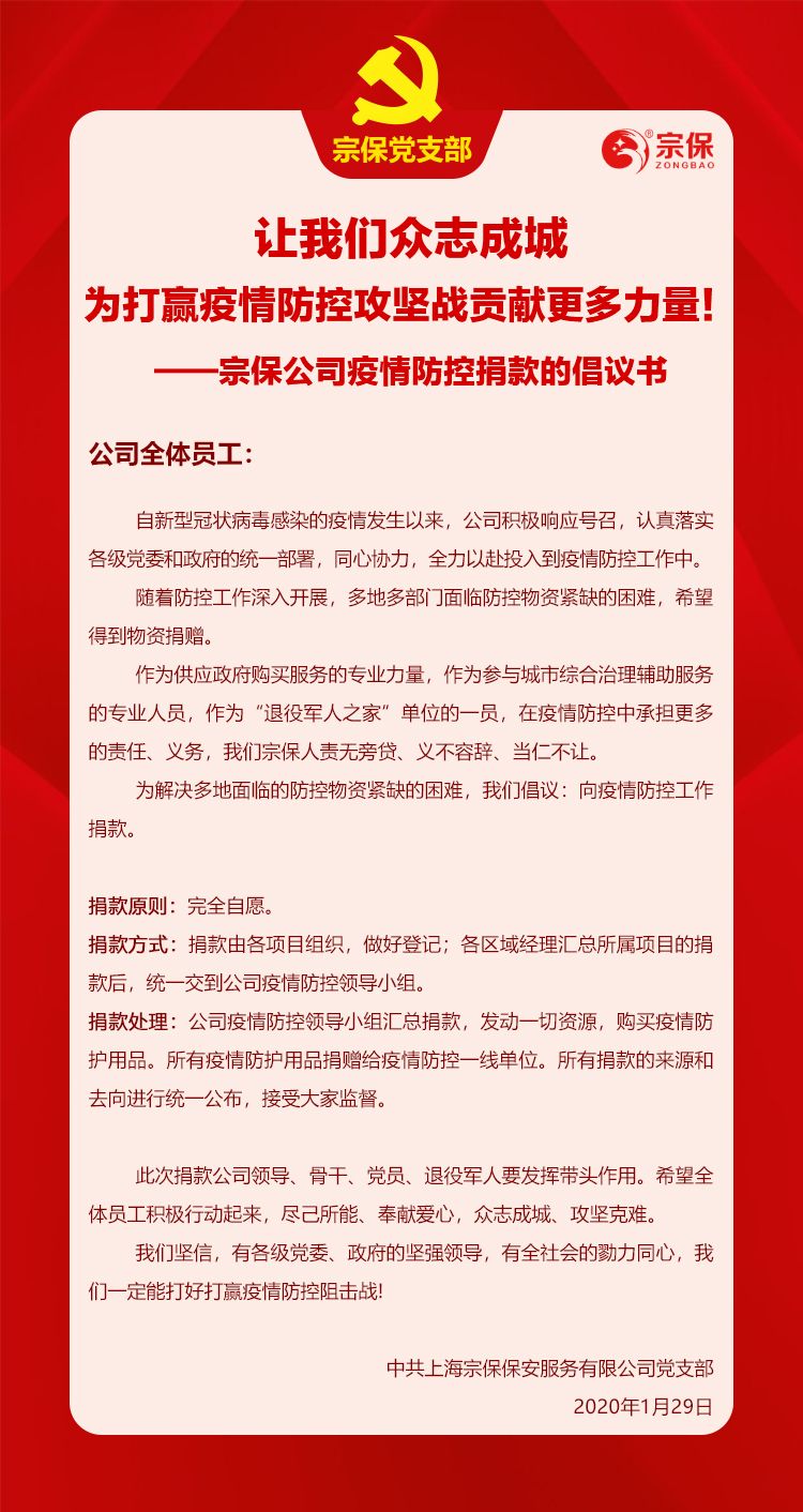 2月4日,宗保公司黨支部發(fā)出的一封《讓我們眾志成城,為打贏疫情防控阻擊戰(zhàn)貢獻更多力量》號召員工向疫情防控工作一線單位捐款的倡議書,在公司內(nèi)部引起了熱烈反響。