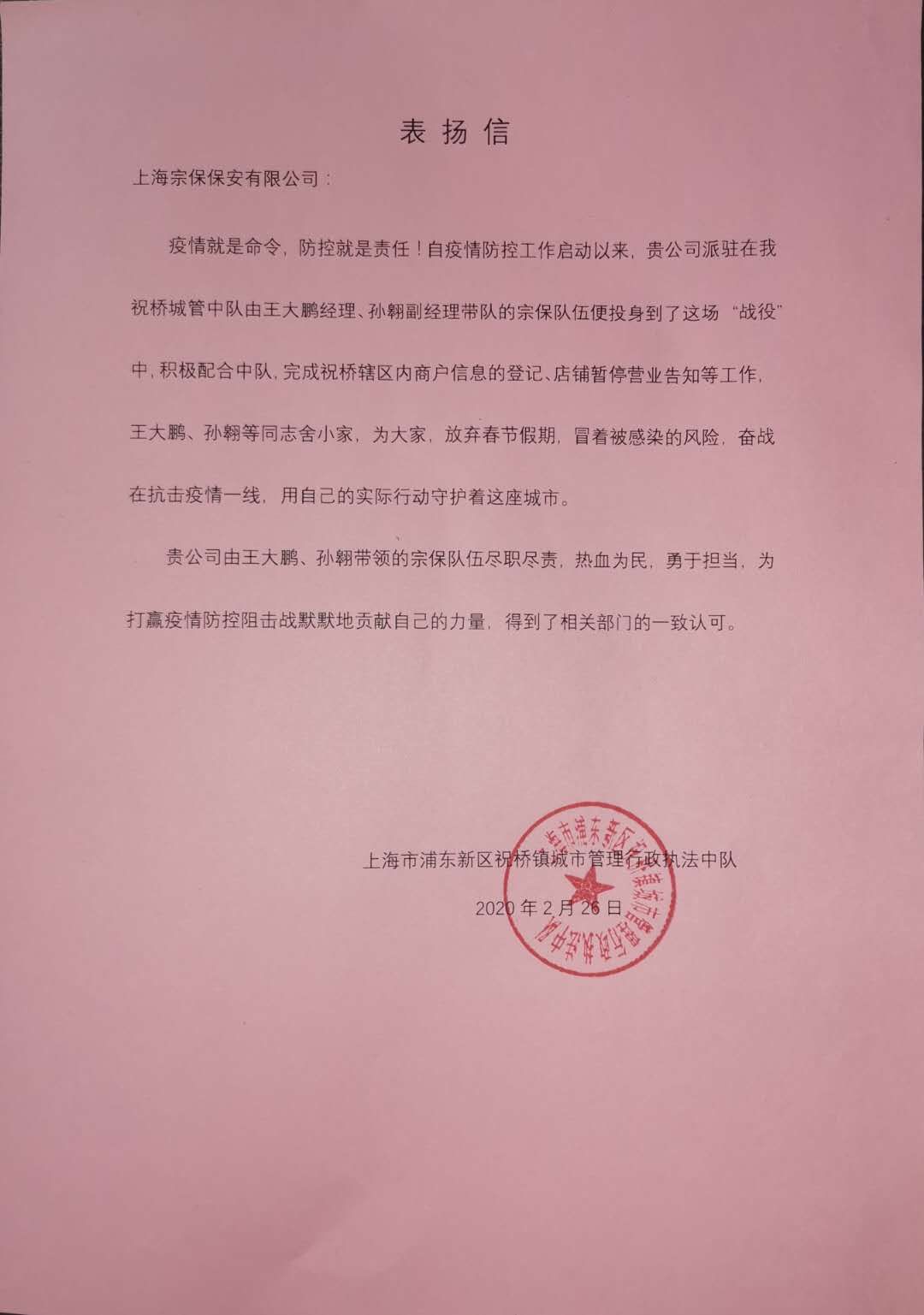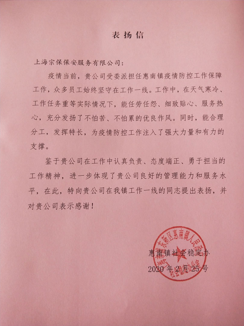 2月25日,浦東新區(qū)惠南鎮(zhèn)穩(wěn)定辦送來表揚信,表揚宗保公司駐惠南市容項目全體隊員在疫情防控中認真負責、態(tài)度端正、勇于承擔的工作精神。