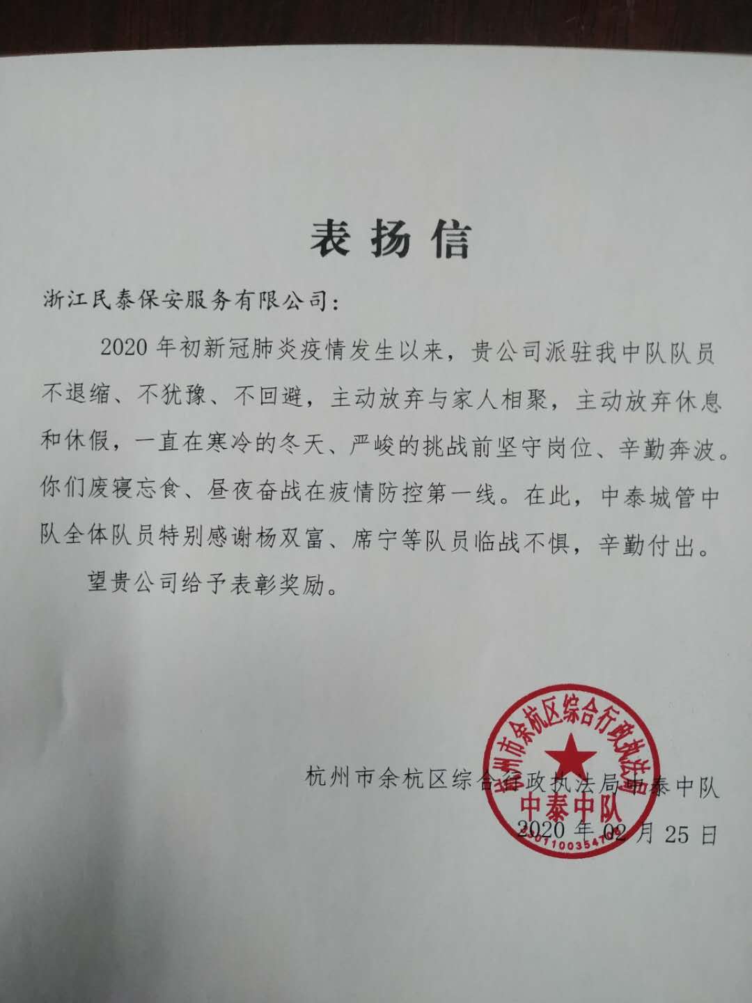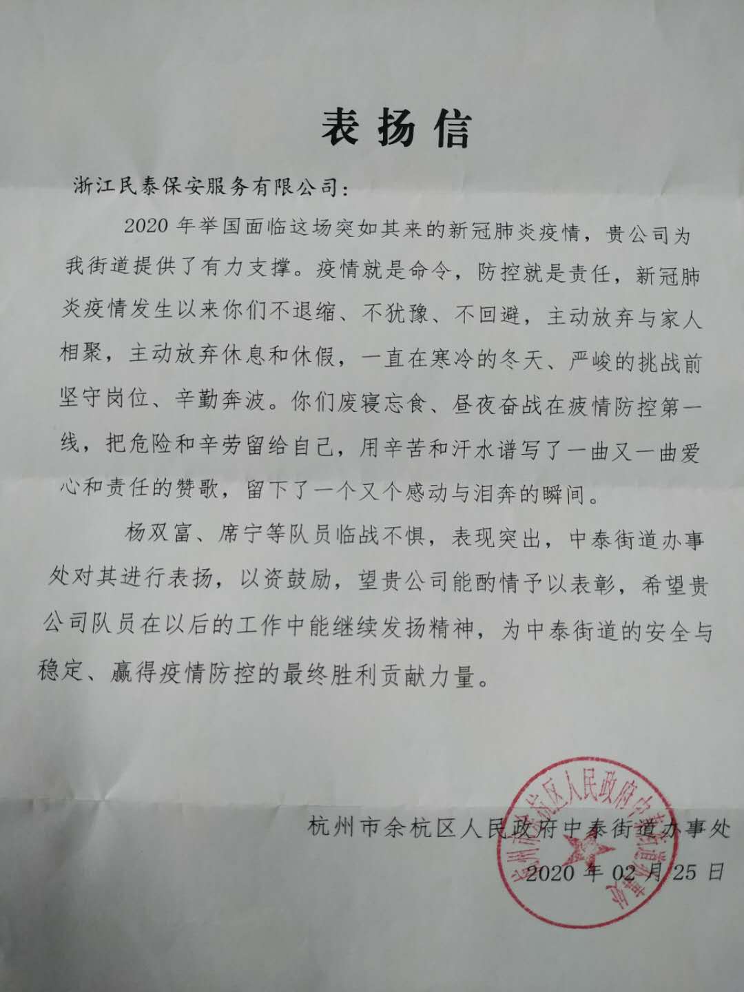 2月25日,杭州市余杭區(qū)中泰街道辦事處和該街道城管隊分別送來表揚信,表揚浙江民泰公司駐該街道城管項目全體隊員在疫情防控中的工作表現(xiàn),點名表揚楊雙富、席寧兩名隊員。