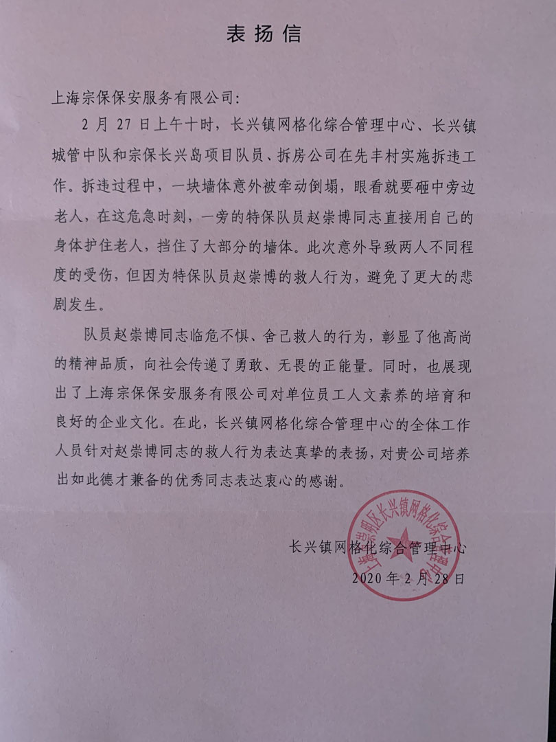 2月28日,宗保公司收到崇明區(qū)長興鎮(zhèn)網(wǎng)格化管理中心送來的表揚信,高度贊揚公司駐長興島城管項目隊員趙崇博在拆違過程中臨危不懼、舍己救人的行為。