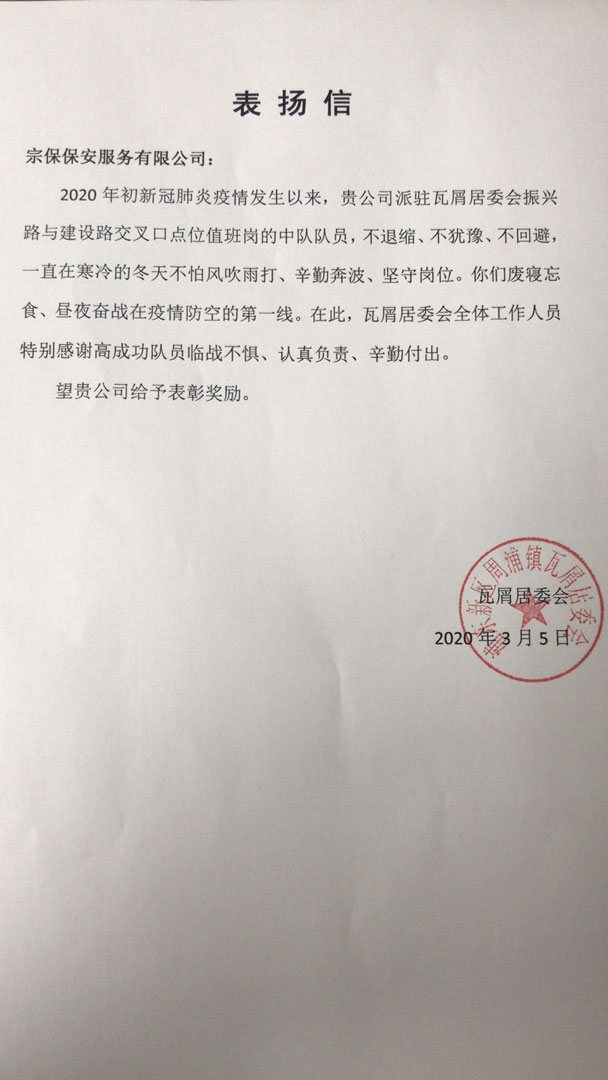3月8日,張江鎮(zhèn)中心居委送來表揚信,表揚公司駐孫橋輔警項目全體隊員,感謝宗保公司在這次疫情防控中及時伸出援手,增派輔警力量值守固定崗位,增強防控力量。