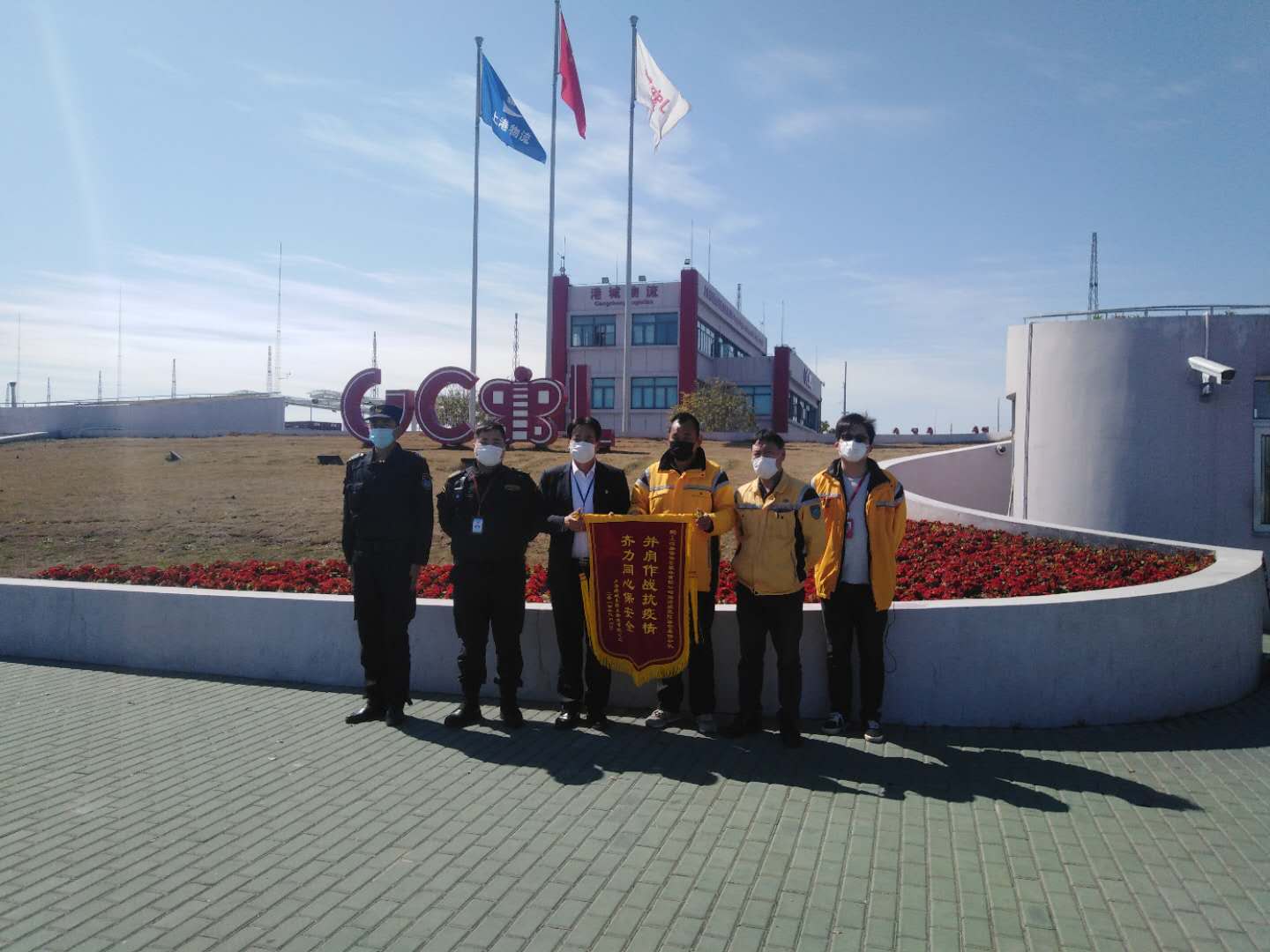 3月16日,上海港城集團(tuán)危險(xiǎn)品物流有限公司安監(jiān)部劉兆斌主任等一行專(zhuān)程來(lái)到宗保公司駐臨港危險(xiǎn)品倉(cāng)庫(kù)項(xiàng)目,將繡有“并肩作戰(zhàn)抗疫情,齊力同心保安全”的錦旗贈(zèng)予該項(xiàng)目全體隊(duì)員,感謝他們對(duì)防疫工作的全力協(xié)助和辛勤付出。