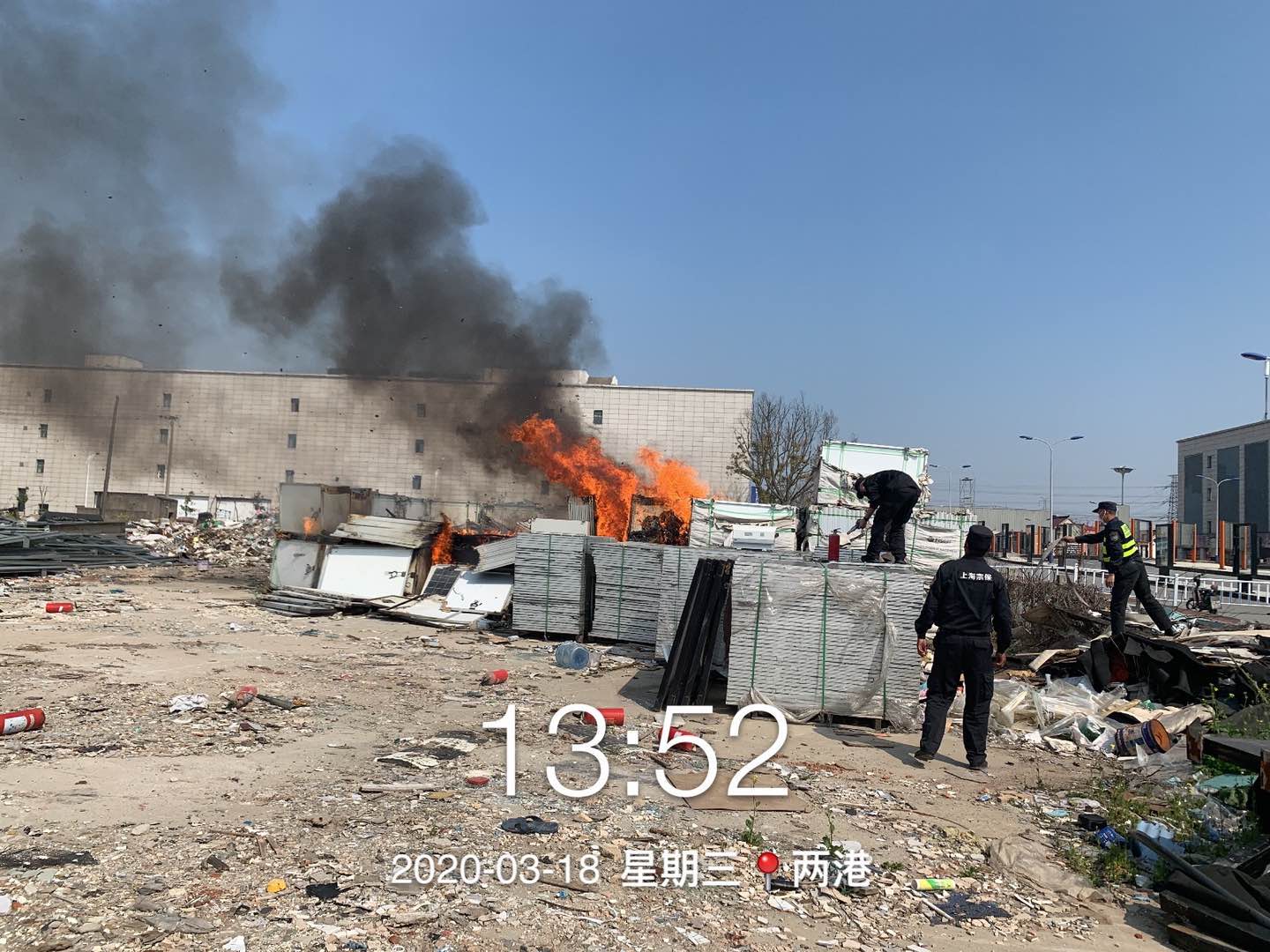 2020年3月18 日13:50,南六公路699號北側(cè)閑置空地發(fā)生了一起由廢棄物自燃引起的火災(zāi)。宗保公司駐兩港裝飾城隊員巡邏中發(fā)現(xiàn)火情,立即報告保安部,并急赴現(xiàn)場進行滅火,同時撥打“119”火警電話報警。
