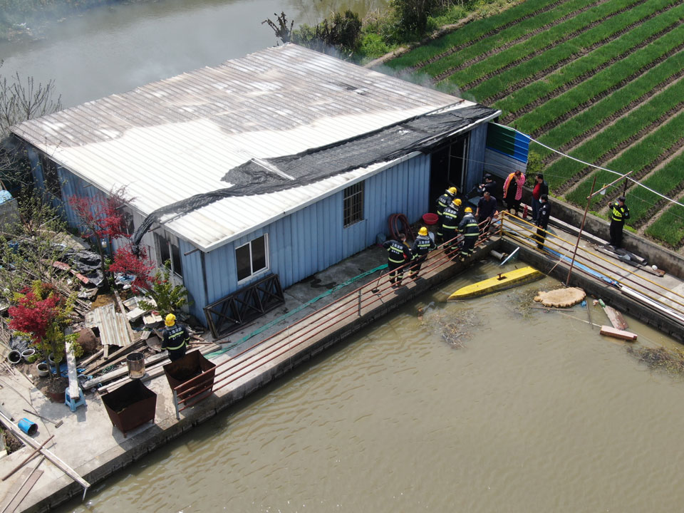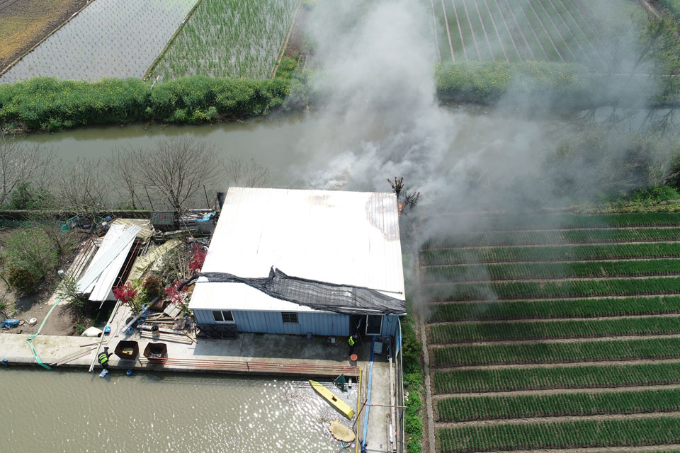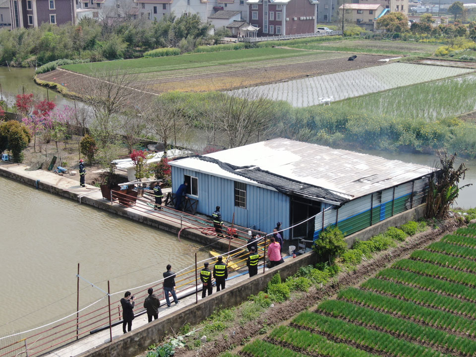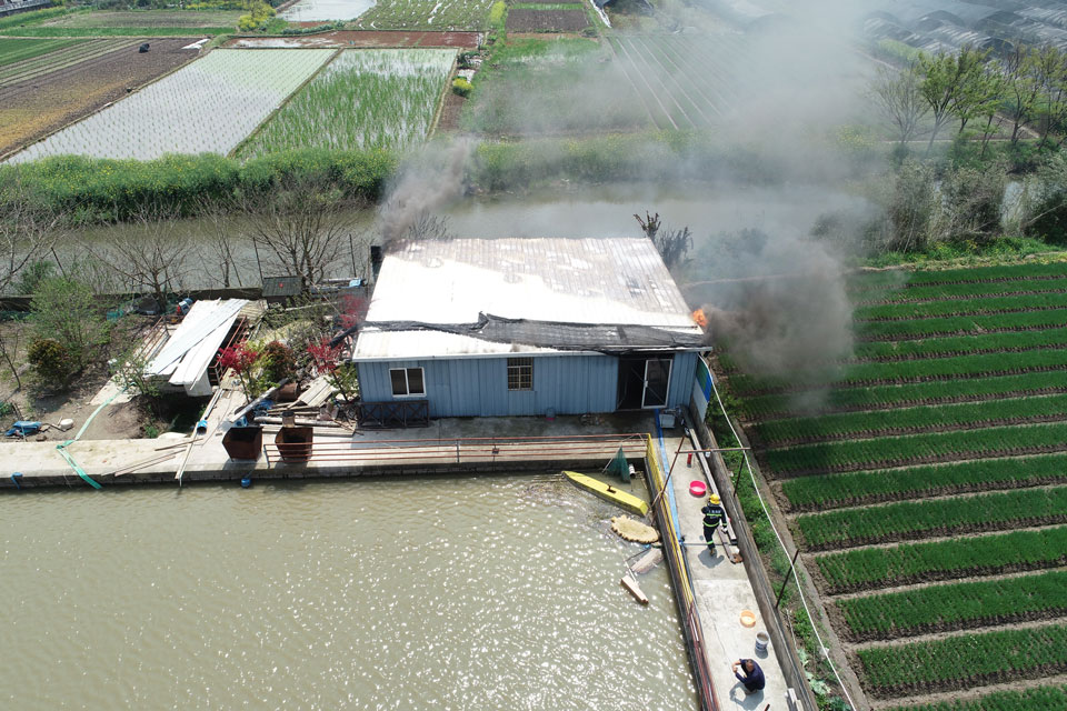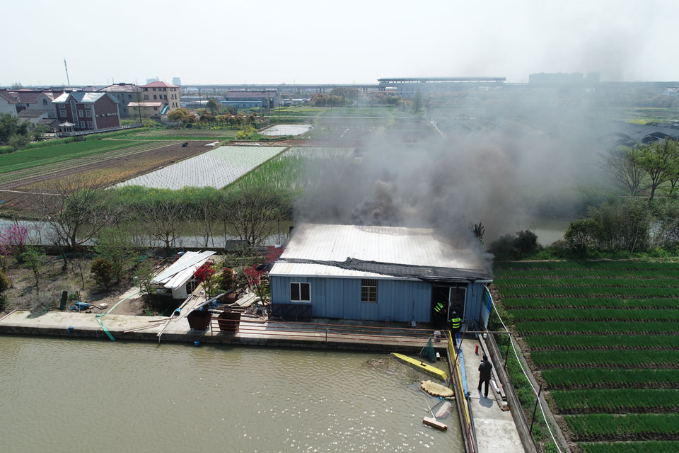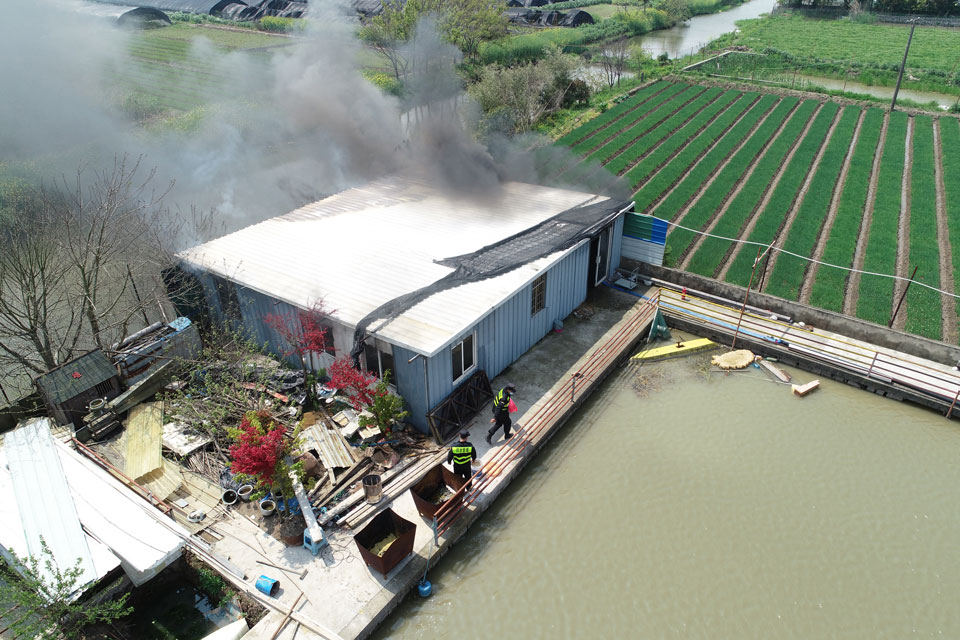 4月1日上午,宗保公司的無人機飛手王凱奇、王鵬飛在浦東新區(qū)宣橋鎮(zhèn)一地塊上空執(zhí)行無人機三維建模航拍任務(wù),無人機在返航過程中發(fā)現(xiàn)該地塊有一處臨時搭建的房子冒著濃煙?!安缓茫i飛,稻田旁邊的房子像是著火了,趕快通知地塊看守的隊員先去看看情況。”王凱奇一邊穩(wěn)穩(wěn)地操控著無人機,一邊焦急地對身邊的王鵬飛說。
