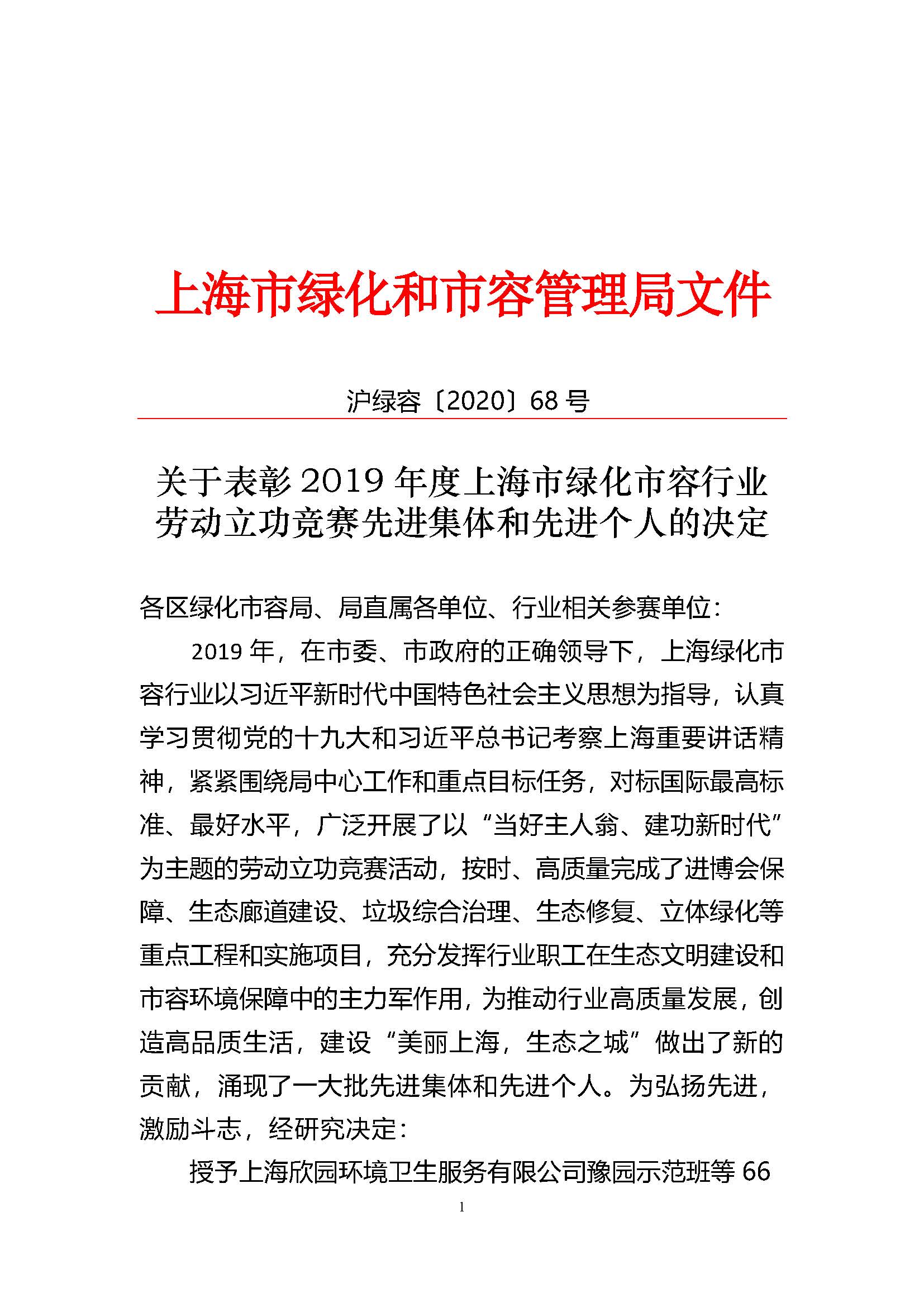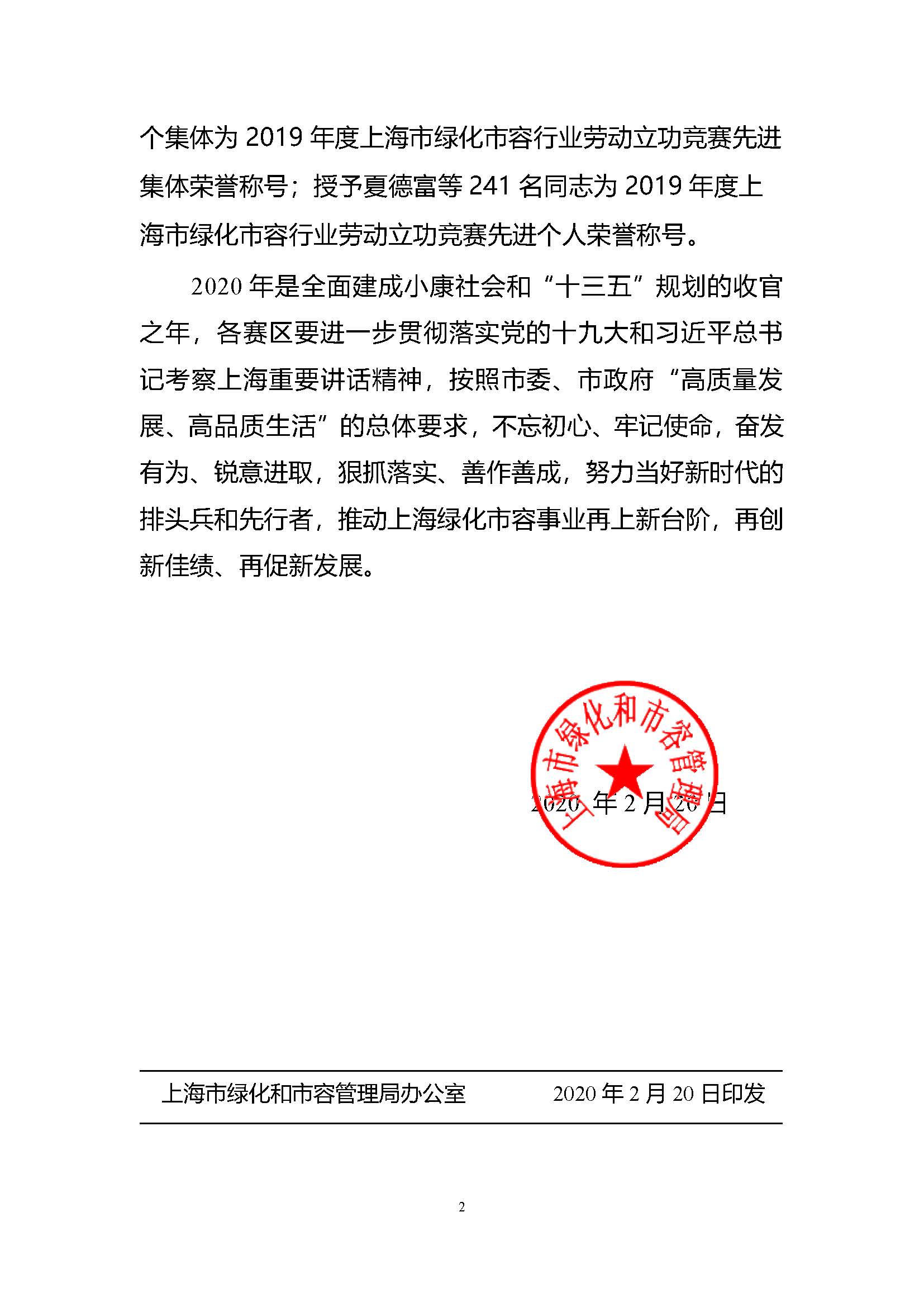 近日,上海市綠化和市容管理局下發(fā)了《關于表彰2019年度上海市綠化市容行業(yè)勞動立功競賽先進集體和先進個人的決定》,上海宗保保安服務有限公司東灘保安隊被授予“2019年度上海市綠化市容行業(yè)勞動立功競賽先進集體”榮譽稱號。