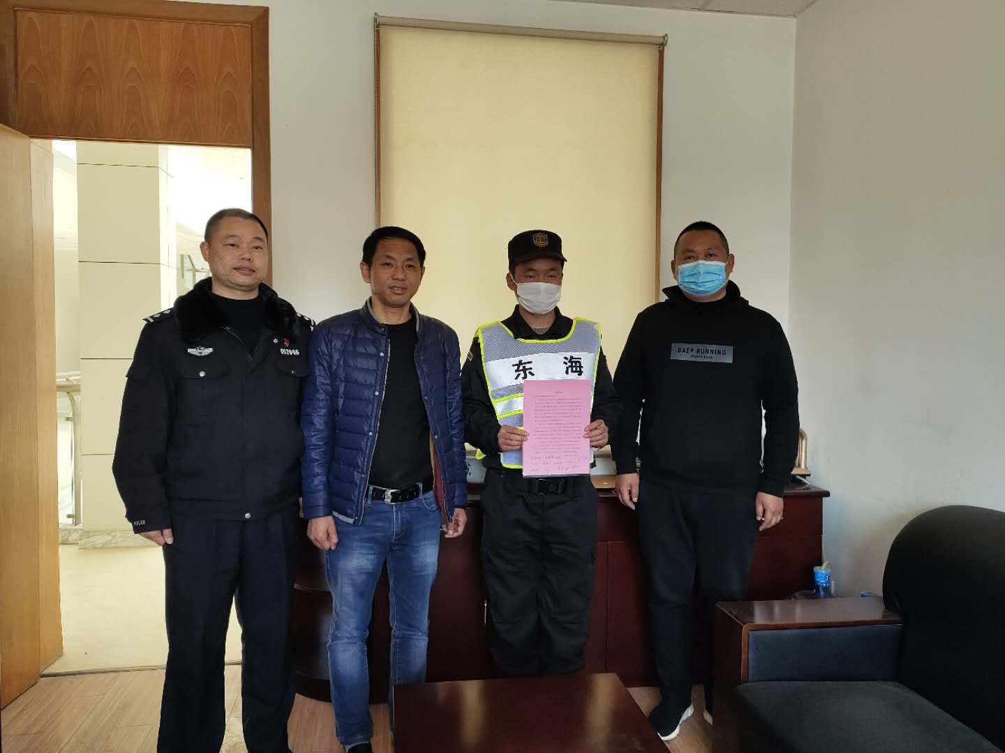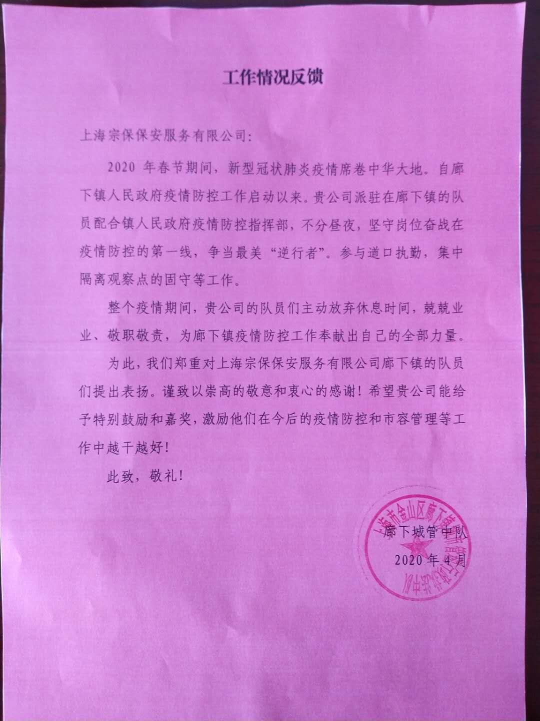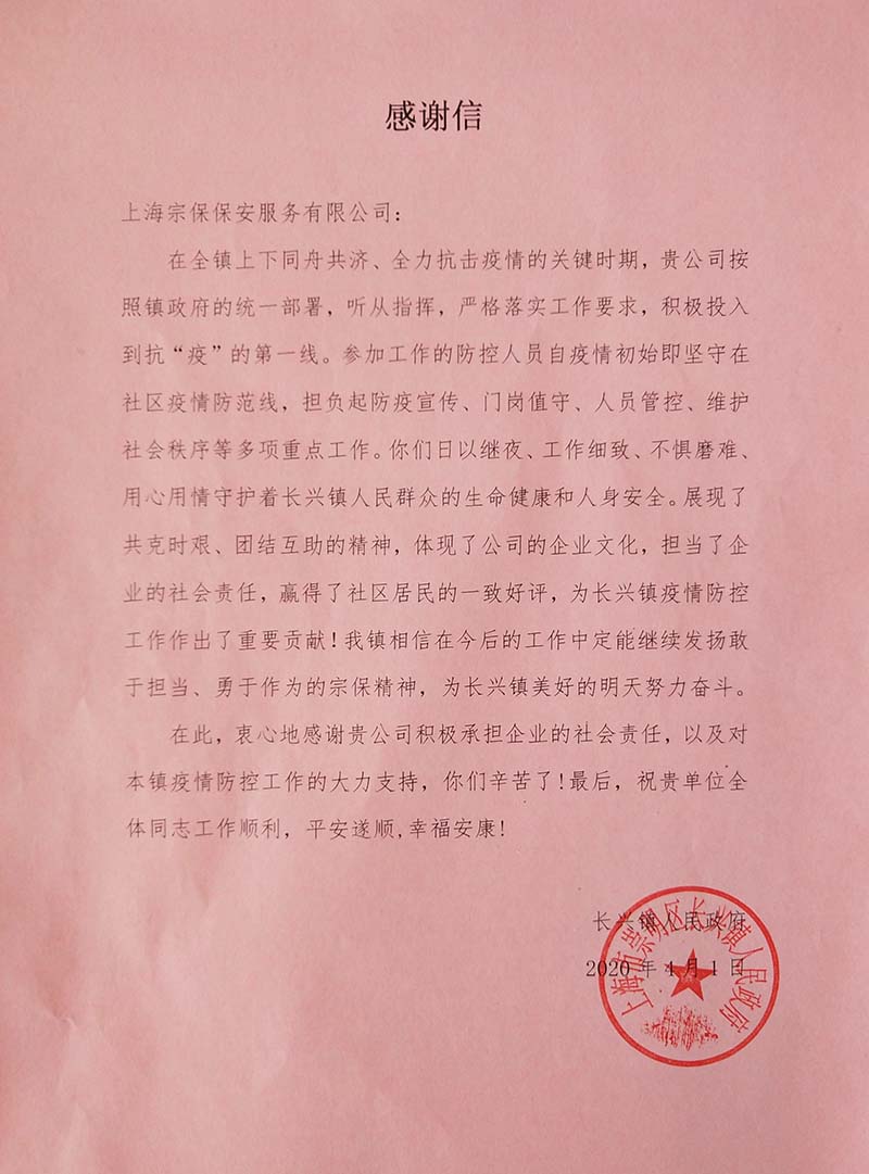 4月10日,宗保公司駐周浦輔警項目收到甲方的感謝信,信中對參與35號集中醫(yī)學觀察點的趙閃軍等10名保安員提出表揚并表示感謝。