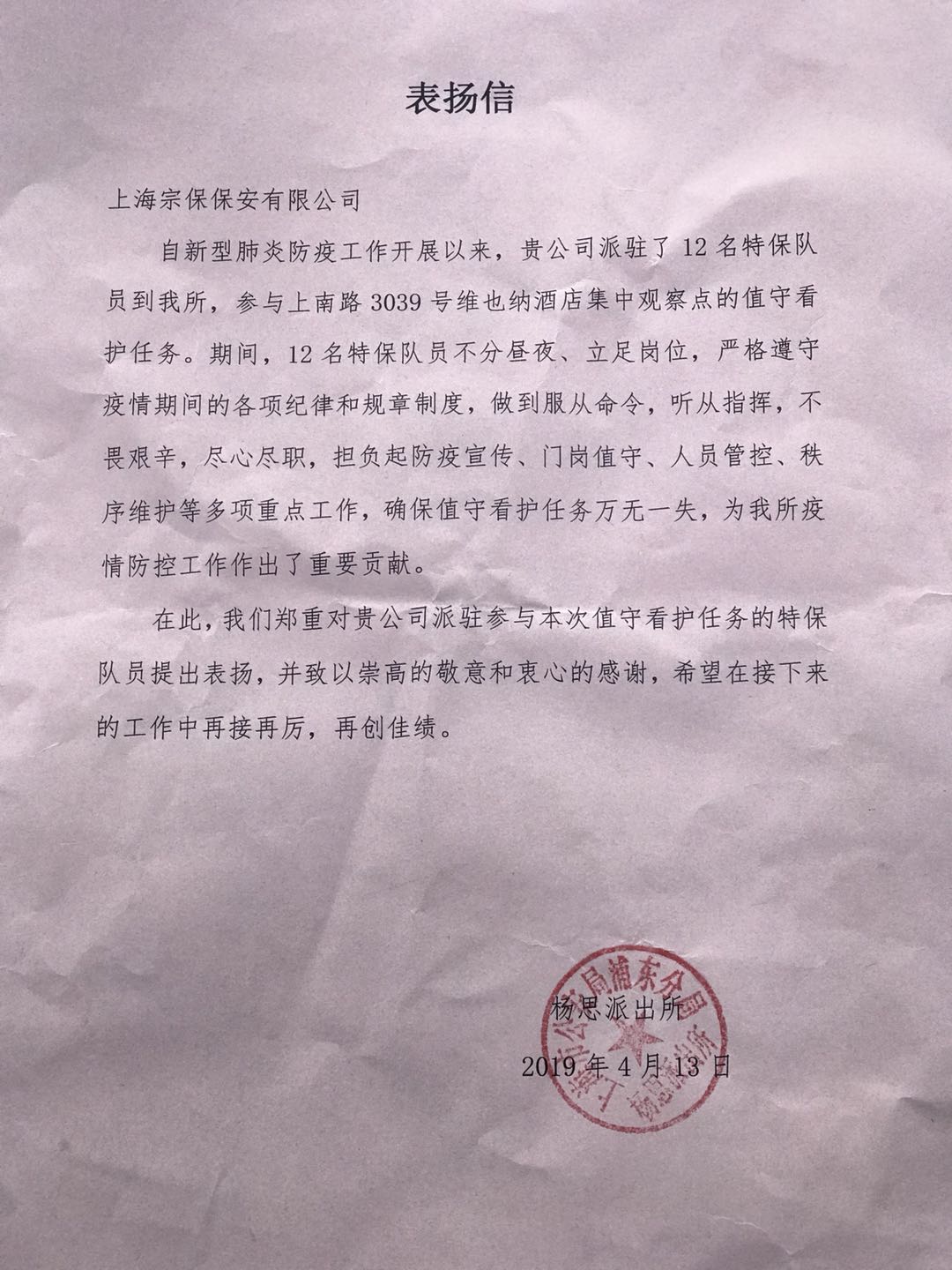 4月13日,宗保公司駐三林鎮(zhèn)市容項(xiàng)目收到楊思派出所送來(lái)的一封表?yè)P(yáng)信,信中對(duì)三林鎮(zhèn)市容項(xiàng)目參與XX酒店集中醫(yī)學(xué)觀察點(diǎn)值守看護(hù)任務(wù)的宗保隊(duì)員提出表?yè)P(yáng)和感謝。