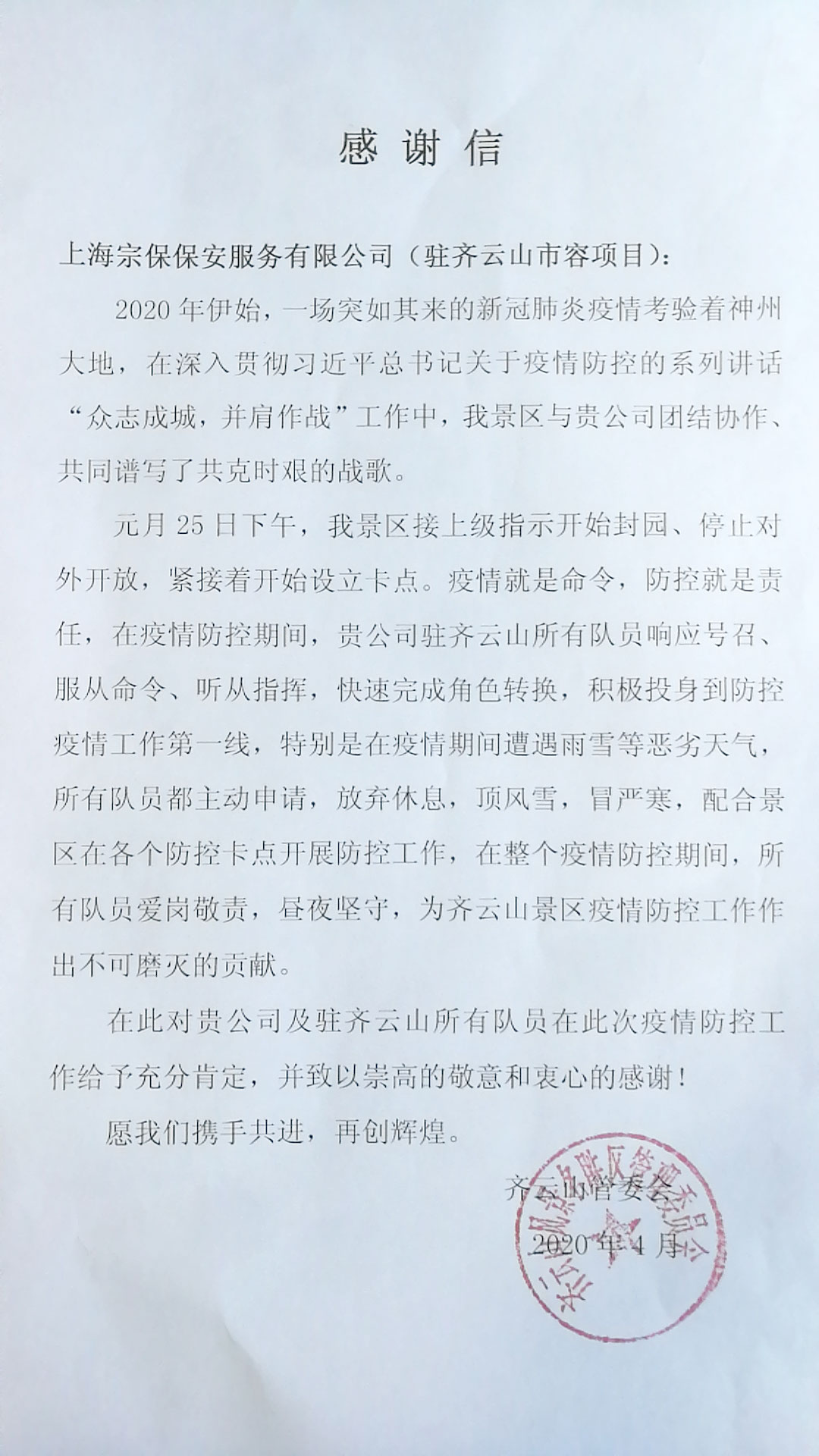 4月16日,宗保公司駐黃山區(qū)域齊云山市容項(xiàng)目收到齊云山管委會(huì)的一封感謝信,對(duì)在疫情防控期間付出辛勞的宗保隊(duì)員們表示肯定和感謝。