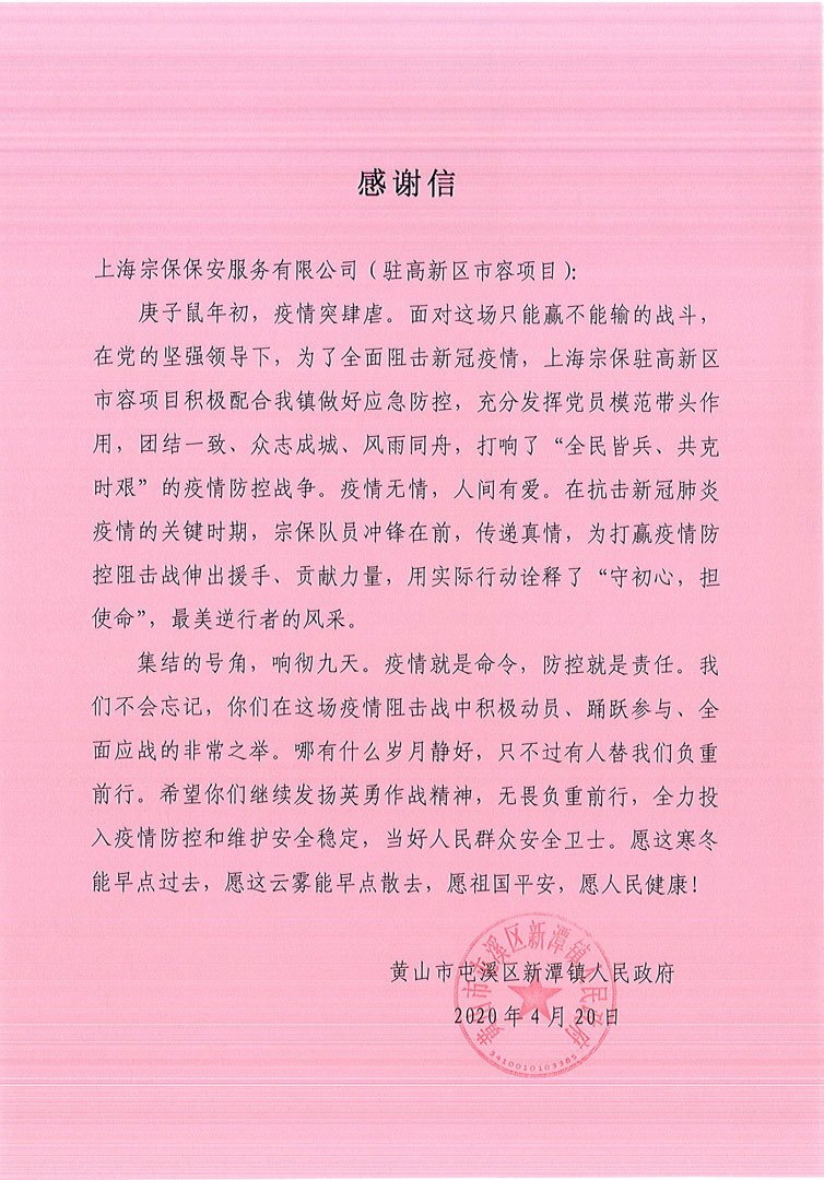 4月25日,宗保公司收到浦東新區(qū)張江鎮(zhèn)人民政府的感謝信。信中對宗保公司以善行擔起守望相助的社會責任,用義舉筑起抗擊疫情的家園情懷,表示感謝和敬意!