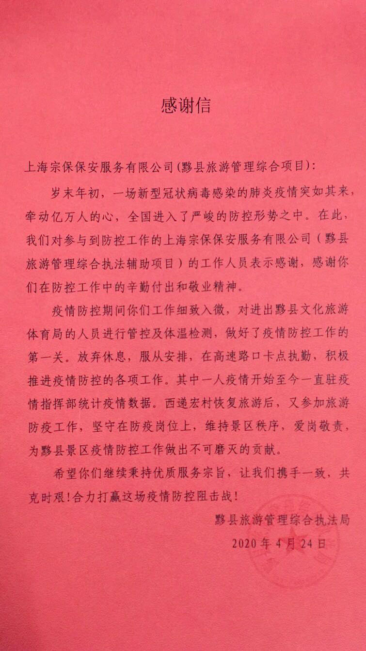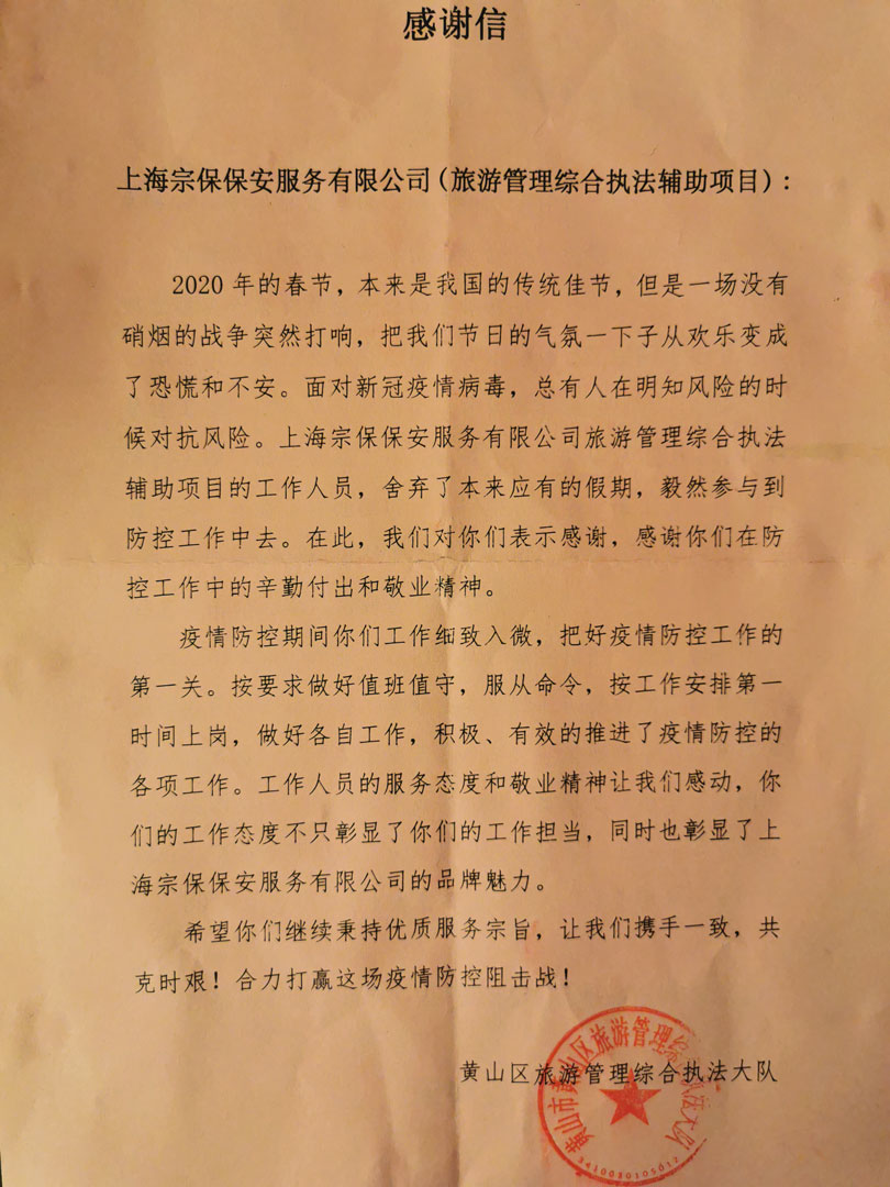 4月24日,宗保公司駐黃山市黟縣旅游管理綜合項目收到黟縣旅游管理綜合執(zhí)法局的一封感謝信,信中對公司全體隊員在疫情防控工作中的辛勤付出和敬業(yè)精神表示感謝。
