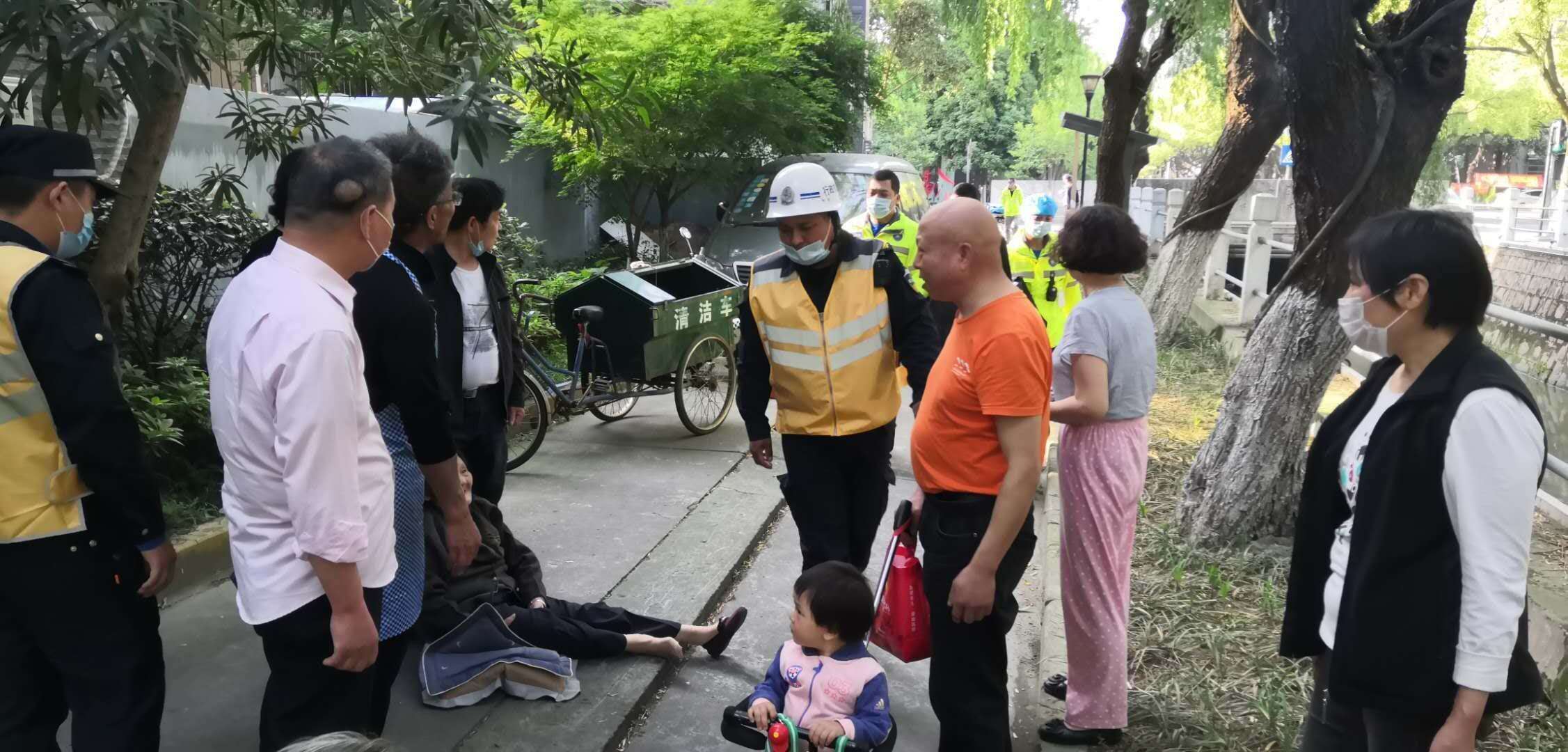 4月29日16:30,臨平街道九曲營路與梅堰路口,一位外出遛彎的老太太突然摔倒在地,腿部傷勢過重?zé)o法起身。民泰公司駐臨平市容項(xiàng)目隊(duì)員張艮振正好巡邏至此,立馬跑過去查看老人傷勢,安慰老人情緒,并撥打120急救電話。