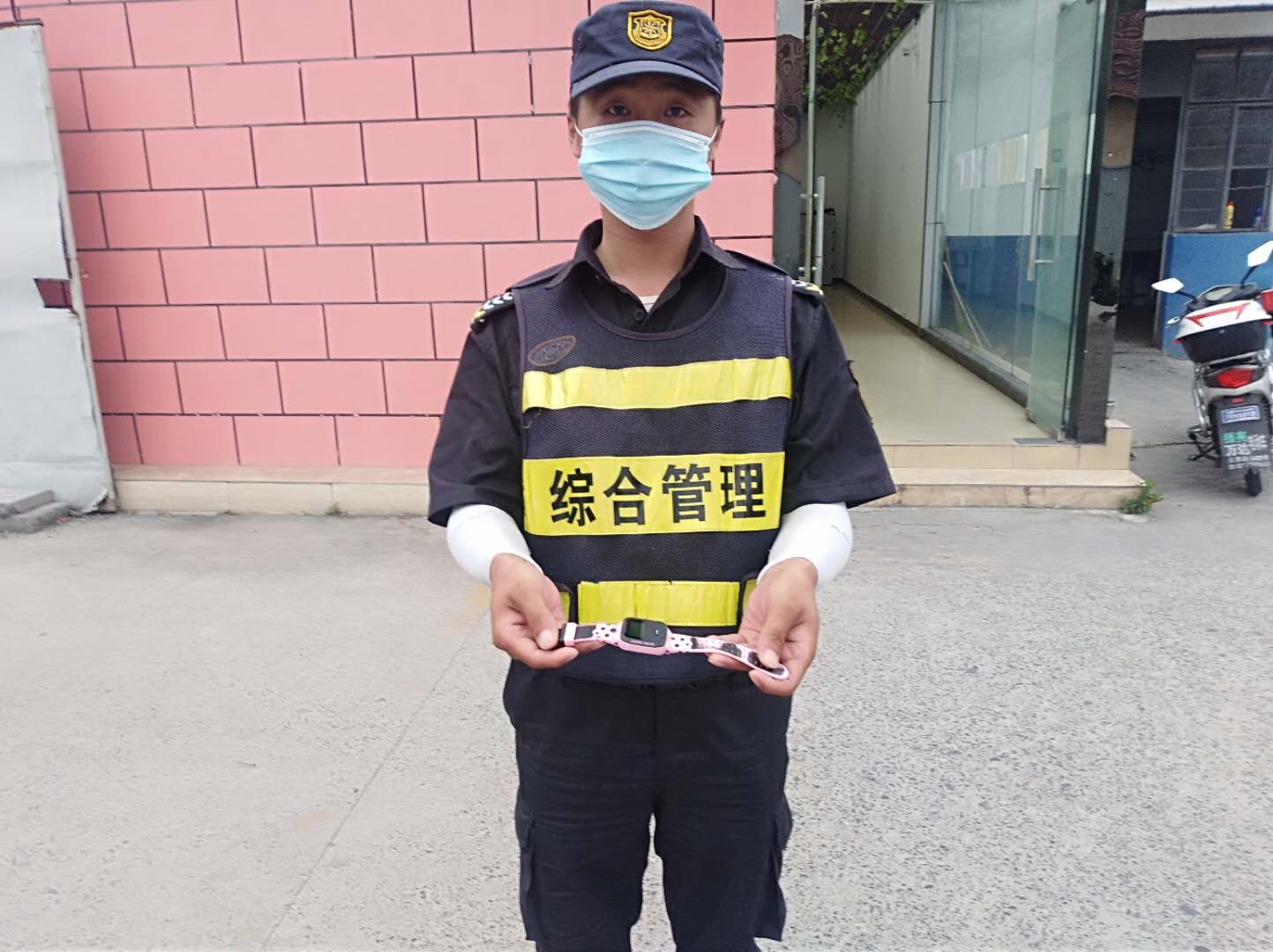 5月24日17點,宗保公司駐三林市容項目隊員范金元巡邏至高青路地鐵站附近時,發(fā)現(xiàn)一塊學(xué)生用智能手表,可能是附近小朋友放學(xué)路上不小心遺失的,肯定會打電話過來。因手表有定位功能,小范不想失主跑太多路,就在原地等待。
