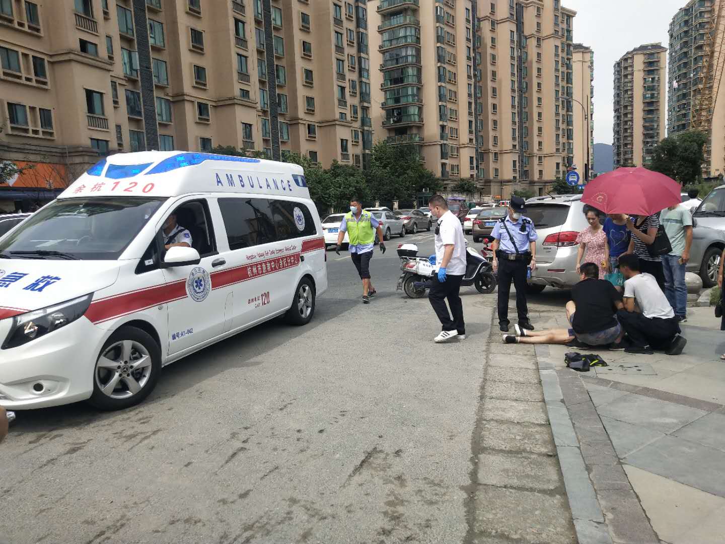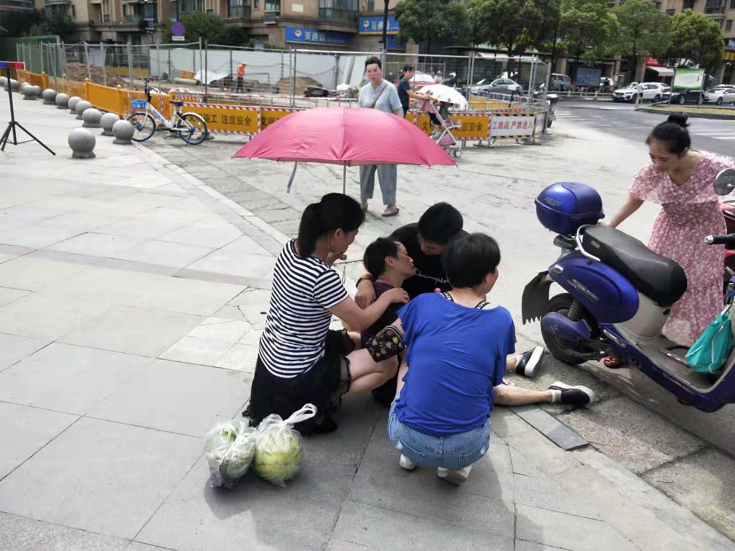 向榮立刻撥打120急救電話,同時(shí)脫下自己的外套墊在地上,讓暈倒女子平躺在地,掐她的人中并跟她保持交流,這時(shí)圍觀的市民也紛紛幫忙撐傘遮陽。