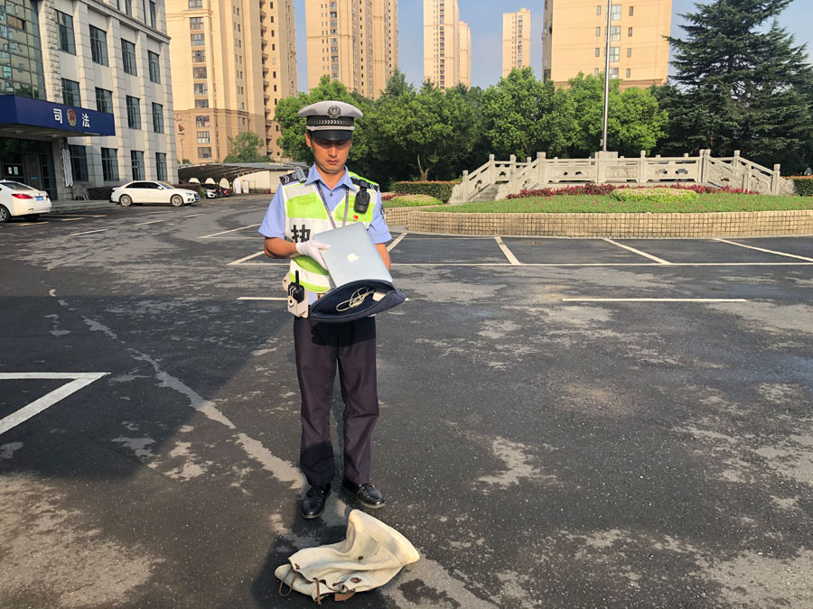 于是,張龍把背包就近放置在閑林街道辦事處保安室門衛(wèi)處,并向工作人員說明情況,然后繼續(xù)執(zhí)勤等待失主回來找尋。大概在8:30早高峰即將換崗的時候,一位穿藍色外套的男士急匆匆地趕過來,詢問張龍和李丹是否撿到一個裝有蘋果電腦的包。張龍將失主帶到門衛(wèi)處認領,經(jīng)核對穿藍色外套的男士確實是失主本人后,就把包內(nèi)電腦及其他貴重物品原封不動地交還了失主。