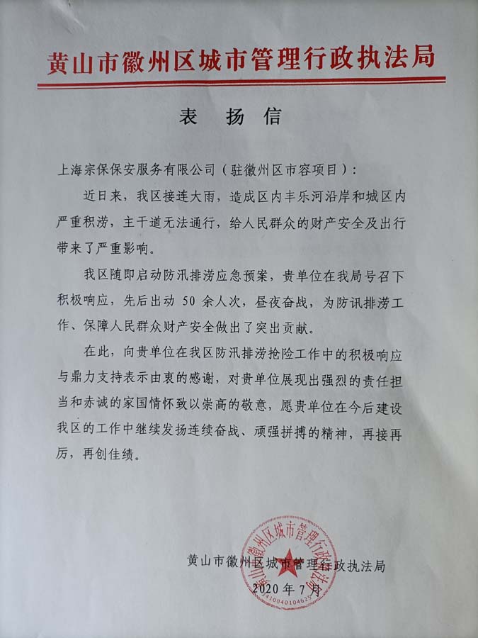 8月4日,宗保公司收到一封來自黃山市徽州區(qū)城市管理行政執(zhí)法局的表揚(yáng)信,信中對在防汛期間,為防汛排澇工作提供有力支撐的公司駐黃山市徽州市容項(xiàng)目提出表揚(yáng)。