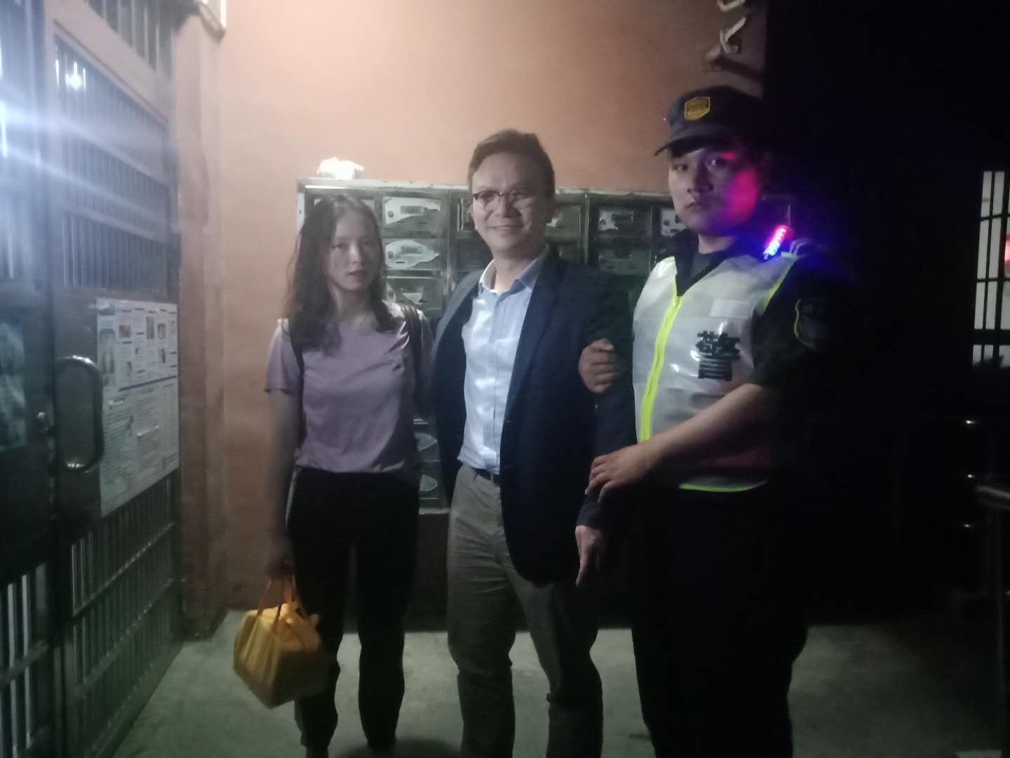 當(dāng)日23:40,金橋交管輔警金葵巡邏隊(duì)員靳龍龍、周長群在金葵路1115弄巡邏時,發(fā)現(xiàn)一名女子攙扶著一男子,行走十分困難。