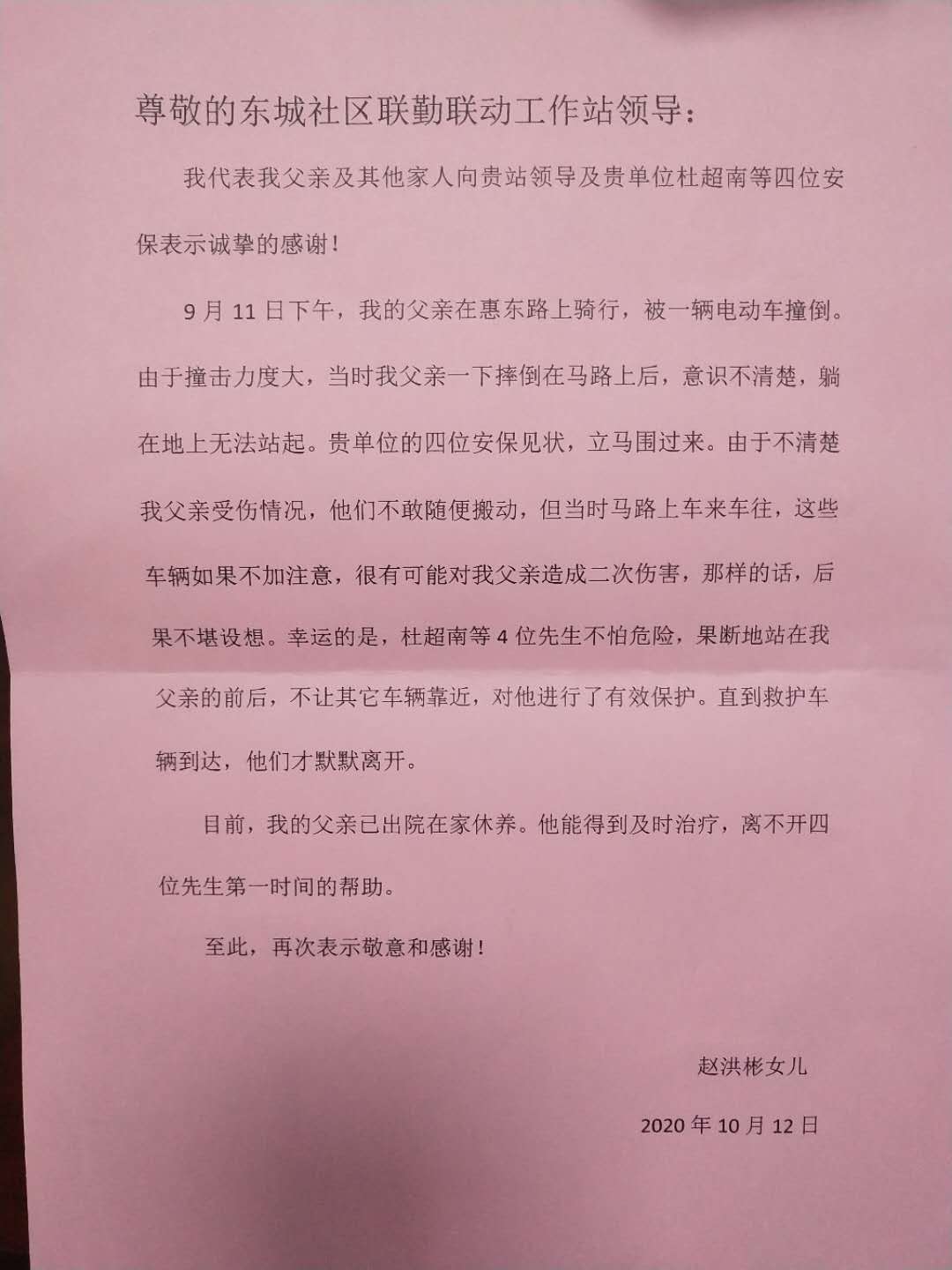 事后,老人家屬通過監(jiān)控了解到是宗保隊(duì)員全力救助了老人, 非常的感動(dòng),特意定制了錦旗,還送來了感謝信。